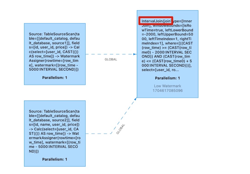 在流处理中,动态表的Join对应着两条数据流的Join操作。Flink SQL中的联结查询大体上也可以分为两类:SQL原生的联结查询方式,和流处理中特有的联结查询 #### 一、常规联结查询(Regular JOIN) 常规联结是SQL中原生定义的Join方式,是最通用的一类联结操作。它的具体语法与标准SQL的联结完全相同,通过关键字JOIN来联结两个表,后面用关键字ON来指明联结条件。 与标准SQL一致,Flink SQL的常规联结也可以分为**内联结(INNER JOIN)**和**外联结(OUTER JOIN)**,区别在于结果中是否包含不符合联结条件的行。 Regular Join 包含以下几种(以 L 作为左流中的数据标识, R 作为右流中的数据标识) | JOIN方式 | 说明 | | ------------ | ------------ | | Inner Join(Inner Equal Join) | 流任务中,只有两条流 Join 到才输出,输出 +[L, R] | | Left Join(Outer Equal Join) | 流任务中,左流数据到达之后,无论有没有 Join 到右流的数据,都会输出(Join 到输出 +[L, R] ,没 Join 到输出 +[L, null] ),如果右流之后数据到达之后,发现左流之前输出过没有 Join 到的数据,则会发起回撤流,先输出 -[L, null] ,然后输出 +[L, R] | |Right Join(Outer Equal Join)| 与Left Join 一样,左表和右表的执行逻辑完全相反| |Full Join(Outer Equal Join)|流任务中,左流或者右流的数据到达之后,无论有没有 Join 到另外一条流的数据,都会输出(对右流来说:Join 到输出 +[L, R] ,没 Join 到输出 +[null, R] ;对左流来说:Join 到输出 +[L, R] ,没 Join 到输出 +[L, null] )。如果一条流的数据到达之后,发现之前另一条流之前输出过没有 Join 到的数据,则会发起回撤流(左流数据到达为例:回撤 -[null, R] ,输出+[L, R] ,右流数据到达为例:回撤 -[L, null] ,输出 +[L, R]| **Regular注意事项**: 流的上游是无限的数据,Flink 会将两条流的所有数据都存储在 State 中,所以 Flink 任务的 State 会无限增大,因此需要为 State 配置合适的 TTL,以防止 State 过大 #### 二、间隔联结查询(Interval JOIN) 目前,Flink DataStream API中的双流Join已支持窗口联结(window join)和间隔联结(interval join) 但在Flink SQL中,两条流的Join就对应着SQL中两个表的Join,这是流处理中特有的联结方式,Flink SQL当前还不支持窗口联结,而间隔联结则已经实现 **间隔联结(Interval Join)返回的,同样是符合约束条件的两条中数据的笛卡尔积。只不过这里的“约束条件”除了常规的联结条件外,还多了一个时间间隔的限制**,具体语法要点如下: ##### 1.两表的联结 间隔联结不需要用JOIN关键字,直接在FROM后将要联结的两表列出来就可以,用逗号分隔。这与标准SQL中的语法一致,表示一个“交叉联结”(Cross Join),会返回两表中所有行的笛卡尔积。当然,如果要用JOIN关键字也可以 ##### 2.联结条件 联结条件用WHERE子句来定义,用一个等值表达式描述。交叉联结之后再用WHERE进行条件筛选,效果跟内联结INNER JOIN ... ON ...非常类似 ##### 3.时间间隔限制 WHERE子句中,联结条件后用AND追加一个时间间隔的限制条件,提取左右两侧表中的时间字段,然后用一个表达式来指明两者需要满足的间隔限制 用法演示(两种写法等价) ```sql -- 写法1 SELECT s1.user_id ,s2.user_id FROM source1 s1 JOIN source2 s2 ON s1.row_time BETWEEN s2.row_time - interval "2" second AND s2.row_time + interval "5" second --写法2 SELECT s1.user_id ,s2.user_id FROM source1 s1, source2 s2 WHERE s1.row_time BETWEEN s2.row_time - interval "2" second AND s2.row_time + interval "5" second ``` 可通过Flink WEB UI看到JOIN的算子是Interval JOIN  #### 三、维表联结查询(Lookup Join) Lookup Join 其实就是维表 Join,实时获取外部缓存的 Join,Lookup 的意思就是实时查找 上面说的这几种 Join 都是流与流之间的 Join,而 Lookup Join 是流与 Redis,Mysql,HBase 这种外部存储介质的 Join 注意:`Lookup JOIN仅支持处理时间字段` 关联语法 ``` SELECT o.order_id, o.total, c.country, c.zip FROM Orders AS o JOIN Customers FOR SYSTEM_TIME AS OF o.proc_time AS c ON o.customer_id = c.id; ``` 在这里,订单实时流与 MySQL维表通过id关联获取维度信息