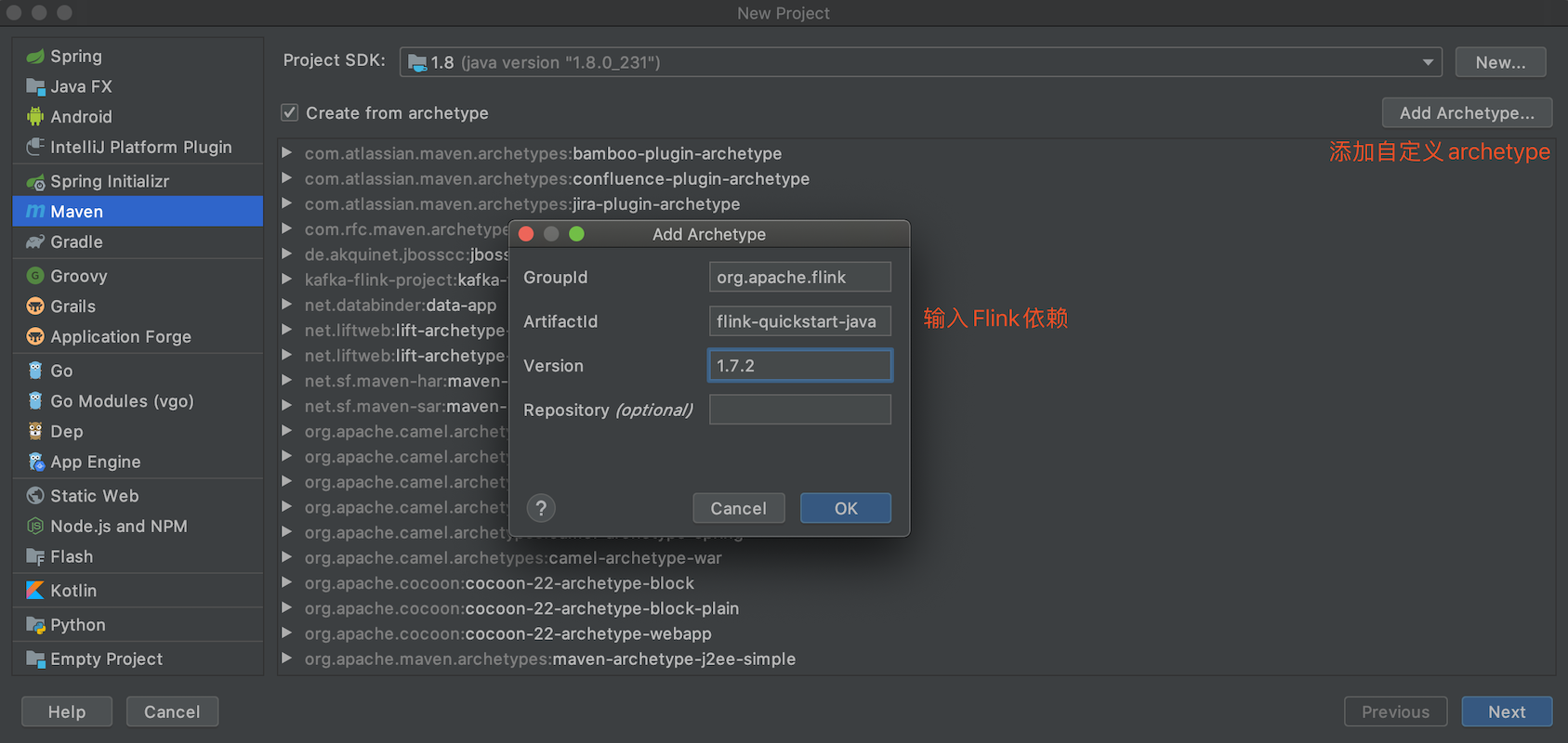 #####创建maven项目 用Intellij IDEA或者Visual Studio Code均可 #####配置maven环境 注意:setting.xml文件里面默认是国外的中央仓库,build的时候会非常慢,建议改成阿里云的,如下配置: ``` <mirror>xml <id>nexus-aliyun</id> <mirrorOf>*</mirrorOf> <name>Nexus aliyun</name> <url>http://maven.aliyun.com/nexus/content/groups/public</url> </mirror> ``` 使用IDEA创建Flink项目(如下图)  #####构建成功后的项目结构如下 ``` 14:37:47|libins ~/vscode$ tree my-kafka-flink-project/ my-kafka-flink-project/ ├── my-kafka-flink-project.iml ├── pom.xml └── src └── main ├── java │ └── cn │ └──libins │ ├── BatchJob.java │ └── StreamingJob.java └── resources └── log4j.properties 6 directories, 5 files ``` #####编写WordCount程序 在源文件目录下创建Java文件SocketWindowWordCount.java ```java package cn.libins; import org.apache.flink.api.common.functions.FlatMapFunction; import org.apache.flink.api.java.tuple.Tuple2; import org.apache.flink.streaming.api.datastream.DataStream; import org.apache.flink.streaming.api.environment.StreamExecutionEnvironment; import org.apache.flink.streaming.api.windowing.time.Time; import org.apache.flink.util.Collector; public class SocketWindowWordCount { public static void main(String[] args) throws Exception { // 创建 execution environment final StreamExecutionEnvironment env = StreamExecutionEnvironment.getExecutionEnvironment(); // 通过连接 socket 获取输入数据,这里连接到本地9000端口,如果9000端口已被占用,请换一个端口 DataStream<String> text = env.socketTextStream("localhost", 9000, " "); // 解析数据,按 word 分组,开窗,聚合 DataStream<Tuple2<String, Integer>> windowCounts = text .flatMap(new FlatMapFunction<String, Tuple2<String, Integer>>() { @Override public void flatMap(String value, Collector<Tuple2<String, Integer>> out) { for (String word : value.split("s")) { out.collect(Tuple2.of(word, 1)); } } }) .keyBy(0) .timeWindow(Time.seconds(5)) .sum(1); // 将结果打印到控制台,注意这里使用的是单线程打印,而非多线程 windowCounts.print().setParallelism(1); env.execute("Socket Window WordCount"); } } ``` #####执行程序 执行时需要注意两点: - 1、在IDE执行上面创建的main方法之前。先配置下Run/Debug属性,勾选依赖。具体操作步骤是: 右键main方所在的Java文--->选择"Edit SocketWindow..."选项--->在弹出的对话框中勾选Include dependencies with "provided scope" 2、一定先开启9000端口再执行main方法,否则Java程序报错(Connection Refused) 本地终端开启9000端口,模拟生产数据:`$ nc -lk 9000` 在开启的9000端口终端输入一些测试单词,在IDE的输出控制台能够实时看到统计的结果