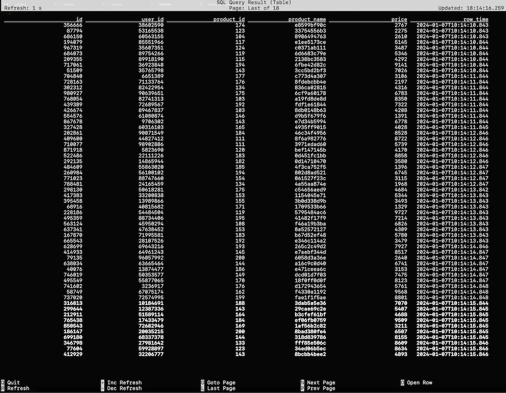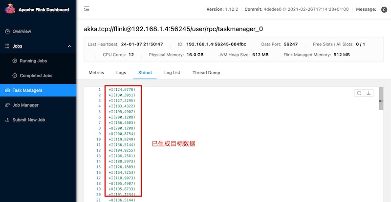 在实际工作中,对于某些实时流场景,有很多实验性的想法、线上问题由于没有快速支持的测试环境,验证、复现非常困难,主要存在如下痛点: - **1.无符合对应场景的实验数据,自己写完造数据的脚本,可能半天过去了** - **2.没有即用即停的Flink测试环境,使用公司线上环境又无法与自己造的数据打通** 而这些问题,Flink官方都为我们想到了,以下分两部分介绍搭建过程,即:一键搭建本地执行环境,一键生成稳定测试数据 #### 一键搭建本地执行环境 ##### 1.下载Flink编译好的二进制包 **环境说明:** Flink版本:1.12.2 本地环境:Mac OS **下载地址:https://archive.apache.org/dist/flink/** *注意:Flink官网只支持最新稳定版本下载,如果要下载历史版本,请点击本文档给的链接即可 * ##### 2.本地解压并启动集群 ``` # 解压 tar -zxvf flink-1.12.2-bin-scala_2.12.tgz -C ~/software/ # 启动集群 cd ~/software/flink-1.12.2/ bin/start-cluster.sh # 停止集群 bin/stop-cluster.sh ``` 启动日志 >Starting cluster. Starting standalonesession daemon on host 192.168.1.4. Starting taskexecutor daemon on host 192.168.1.4. **启动验证** 启动集群的同时, Flink会同步启动Web UI页面,可访问本地8081端口验 http://localhost:8081/#/overview  ##### 3.启动TaskManager(可选) 在Flink集群启动时,会默认启动1个TaskManager,如果你需要的测试环境需要多并行度验证,可通过如下命令启动多个TM(执行一次命令启动一个) ``` # 启动TM bin/taskmanager.sh start # 停止TM bin/taskmanager.sh stop # 停止全部TM bin/taskmanager.sh stop-all ``` 启动日志 >[INFO] 1 instance(s) of taskexecutor are already running on 192.168.1.4. Starting taskexecutor daemon on host 192.168.1.4. 启动成功后可通过Flink Web UI查看启动效果  #### 一键生成稳定测试数据 Flink内置的`datagen`连接器为我们提供了个性化的数据生成器,可通过with参数控制需要生成数据的格式、数据量等 ##### 1.启动Flink SQL Client ``` bin/sql-client.sh embedded ``` 启动成功后,就进入了Flink SQL命令行界面  ##### 2.编辑数据源参数 这里以生成订单数据流为例,包含 **id、user_id、product_id、product_name、price**字段,并以当前系统时间为事件时间, watermark设置为事件时间向前推5秒 具体字段的参数及含义如下 ```sql CREATE TABLE order_source ( id bigint, user_id bigint, product_id bigint, product_name string, price bigint, row_time as cast(current_timestamp as timestamp(3)), watermark for row_time as row_time - interval '5' second ) WITH ( 'connector' = 'datagen', -- 固定写法 'rows-per-second' = '10', -- 每秒生成10条数据 'fields.id.min' = '1', -- id字段最小值 'fields.id.max' = '1000000', -- id字段最最大值 'fields.user_id.min' = '10001', -- user_id字段最小值 'fields.user_id.max' = '99999990', -- user_id字段最大值 'fields.product_id.min' = '101', -- product_id字段最小值 'fields.product_id.max' = '200', -- product_id字段最大值 'fields.product_name.length' = '10',-- product_name字段长度 'fields.price.min' = '1000', -- price字段最小值 'fields.price.max' = '9999' -- price字段最大值 ); ``` ##### 3.查询验证 ``` Flink SQL> select * from order_source; ``` 可看到数据按照配置的参数在持续生成  同时,也可通过Flink Web UI页面查看正在执行的SELECT任务  **至此,测试数据生成完毕,可根据具体的测试、验证场景调节需要生成数据的相关参数** ##### 4.快速生成sink表(可选) 如果某些测试任务暂时不方便将数据写入到数据库或者kafka队列,那么也可以`使用Flink自带的print连接器`将计算好的数据输出到控制台以验证加工逻辑是否符合预期 创建Slink表 ```sql CREATE TABLE aggr_order_info( product_id bigint, price_sum bigint ) WITH ( 'connector' = 'print' ); ``` 实时加工逻辑 ```sql INSERT INTO aggr_order_info SELECT product_id, sum(price) as price_sum FROM order_source GROUP BY product_id; ``` 提交日志 >[INFO] Submitting SQL update statement to the cluster... [INFO] Table update statement has been successfully submitted to the cluster: Job ID: fd845ab922ad013d7889c3fbe5464d9a Flink Web UI验证输出结果