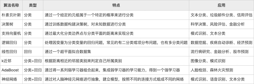 现有的机器学习系统类型繁多,为便于理解,我们根据以下标准将它们进行大的分类 >1.否在人类监督下训练(有监督学习、无监督学习、半监督学习和强化学习) >2.否可以动态地进行增量学习(在线学习和批量学习) >3.简单地将新的数据点和已知的数据点进行匹配,还是像科学家那样,对训练数据进行模式检测然后建立一个预测模型(基于实例的学习和基于模型的学习) #### 有监督学习和无监督学习 根据训练期间接受的监督数量和监督类型,可以将机器学习系统分为以下四个主要类别:`有监督学习、无监督学习、半监督学习和强化学习` ##### 有监督学习 监督学习是指在给定的训练集中“学习”出一个函数(模型参数),当新的数据到来时,可以根据这个函数预测结果 监督学习的训练集要求包括输入和输出,即特征值和目标值(标签),训练集中数据的目标值(标签)是由人工事先进行标注的。 简单地说,监督学习是**包含自变量和因变量(有Y)**,同时可以用于分类和回归 监督学习的步骤如下 ###### 准备数据 监督学习首先要准备数据,没有现成的数据就需要采集数据或者爬取数据,或者从网站上下载数据。可以将准备好的数据集分为训练集、验证集和测试集。训练集是用来训练模型的数据集,验证集是确保模型没有过拟合的数据集,测试集是用来评估模型效果的数据集。 ###### 数据预处理 数据预处理主要包括重复数据检测、数据标准化、数据编码、缺失值处理、异常值处理等。 ###### 特征提取和特征选择 特征提取是结合任务自身特点,通过结合和转换原始特征集,构造出新的特征。特征选择是从大规模的特征空间中提取与任务相关的特征。特征提取和特征选择都是对原始数据进行降维的方法,从而去除数据的无关特征和冗余特征。 ###### 训练模型 模型就是函数,训练模型就是利用已有的数据,通过一些方法确定函数的参数。 ###### 评价模型 对于同一问题会有不同的数学模型,通过模型指标的比较来选取最优模型;对同一数学模型,通过模型指标的比较来调整模型参数。模型评价的基本思路是采用交叉验证方法。 ##### 常见的有监督学习算法  ##### 无监督学习 ###### 无监督学习的定义 非监督学习是指在机器学习过程中,用来训练机器的数据是没有标签的,机器只能依靠自己不断探索,对知识进行归纳和总结,尝试发现数据中的内在规律和特征,从而对训练数据打标签。 ###### 非监督学习的任务 非监督学习的训练数据是无标签的,非监督学习的目标是对观察值进行分类或者区分。 常见的非监督学习算法主要有三种:聚类、降维和关联。聚类算法是非监督学习中最常用的算法,它将观察值聚成一个一个的组,每个组都含有一个或几个特征。聚类的目的是将相似的东西聚在一起,而并不关心这类东西具体是什么。降维指减少一个数据集的变量数量,同时保证传达信息的准确性。关联指的是发现事物共现的概率。 ##### 常见的无监督学习算法