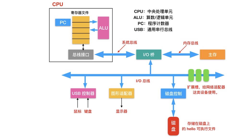 参考书籍:https://book.douban.com/subject/26912767/  第一个C语言程序(HelloWord) ```C #include <stdio.h> int main() { printf("hello word "); return 0 ; } ``` hello程序的生命周期是从一个源程序(或者说是源文件)开始的。即程序员通过编辑器创建并保存的文本文件,文件名是hello.c,源程序实际上就是一个由值为0和1组成的位,8个位被组织成一组,称为字节。每个字节表示程序中的某些文本字符。 为了了解运行HelloWord程序时都发生了些什么。我们需要了解一个典型系统的硬件组织。 ####1、总线 贯穿整个系统的是一组电子管道,称作“总线”,他携带字节信息并负责在各个部件之间传递,通常总线被设计为传送定长的字节块,也就是字(word)。字中的字节数(即字长)是一个基本的系统参数,在各个系统中都不尽相同。现在的大多数机器字长要么是4个字节(32位),要么是8个字节(64位)。 ####2、I/O设备 I/O(输入/输出)设备是系统与外部世界联系的通道。我们的示例系统包括四个I/O设备: 作为用户输入的键盘和鼠标; 作为用户输出的显示器; 用于长期存储数据和程序的磁盘; 每个设备都通过一个控制器或适配器与I/O总线相连,控制器和适配器之间的区别主要在于他们的封装方式,控制器是I/O设备本身或者系统的主板上的芯片组。而适配器则是一块插在主板插槽上的卡。无论如何,他们的功能都是在I/O总线和I/O设备之间传递信息。 ####3、主存 一个临时存储设备,在处理执行程序时,用来存放程序和程序处理的数据。 从物理上来说,主存是由一组动态随机存取存储器(DRAM)芯片组成的。 从逻辑上来说,存储器是一个线性的字节数组,每个字节都有唯一的地址(数据索引),这些地址是从0开始的。 ####4、处理器 即CPU,是解释(或执行)存储在主存中指令的引擎,处理器的核心是一个大小为一个字的存储设备(或寄存器),称为程序计数器(PC),在任何时候,PC都指向主存中的某条机器语言指令(即含有该条指令的地址)。 从系统通电开始,直到系统断电,处理器一直在不断地执行程序计数器(PC)执行的指令,再更新程序计数器,使其指向下一条指令。处理器从程序计数器指向的内存处读取指令,解释指令中的位,执行该指令指示的简单操作。然后更新PC,使其指向下一条指令,而这条指令并不一定和在内存中刚刚执行的指令相邻。