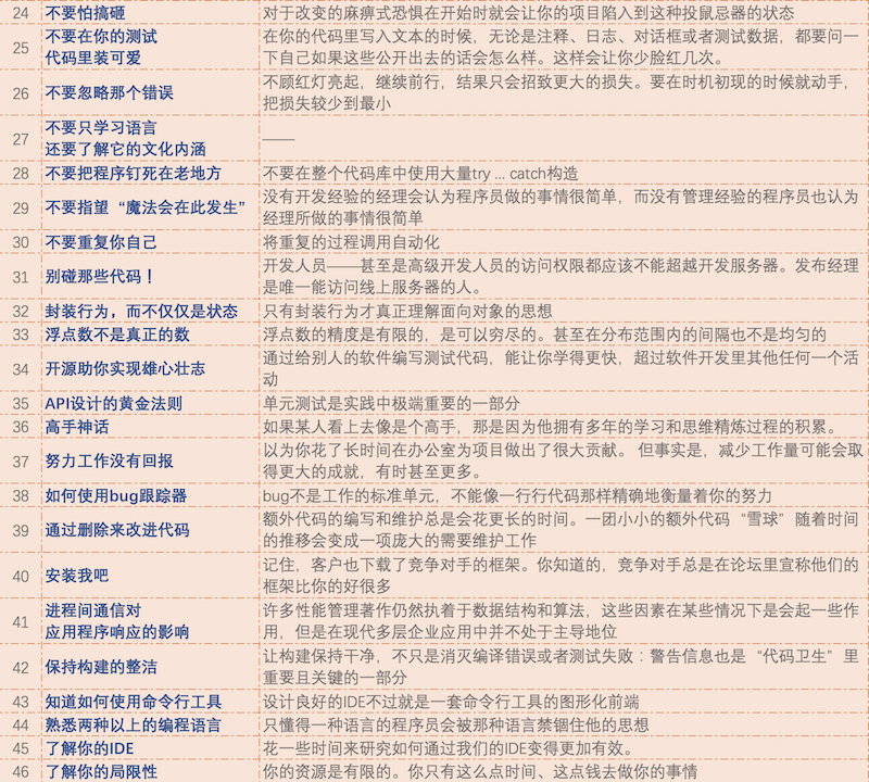 **《每个技术人都应该知道的97件事》**集结了国外一线程序员的经验荟萃,他们根据各自在软件工程各环节里的实践经历,现身说法,提出了自己的真知灼见,这些经验涵盖了用户需求、系统分析设计、编码实践、编码风格、Bug管理和项目管理等多个方面。 以下是这97件事的简单概述整理,更多内容请查看[官网原文链接(英文)](https://97-things-every-x-should-know.gitbooks.io/97-things-every-programmer-should-know/content/en/ "原文链接(英文)") #### 第一部分:前46件 剩下51件[见下篇文章](https://libins.cn/detail/moduleName=suibi&articleId=34efceaf751c714159a1585f041ca18e "见下篇文章")