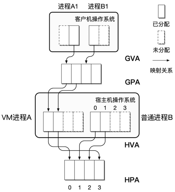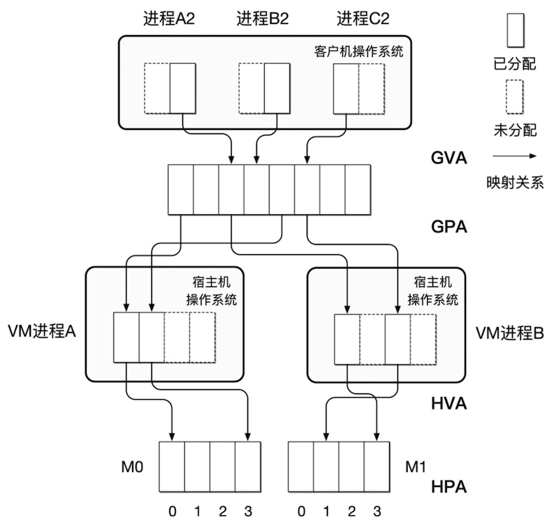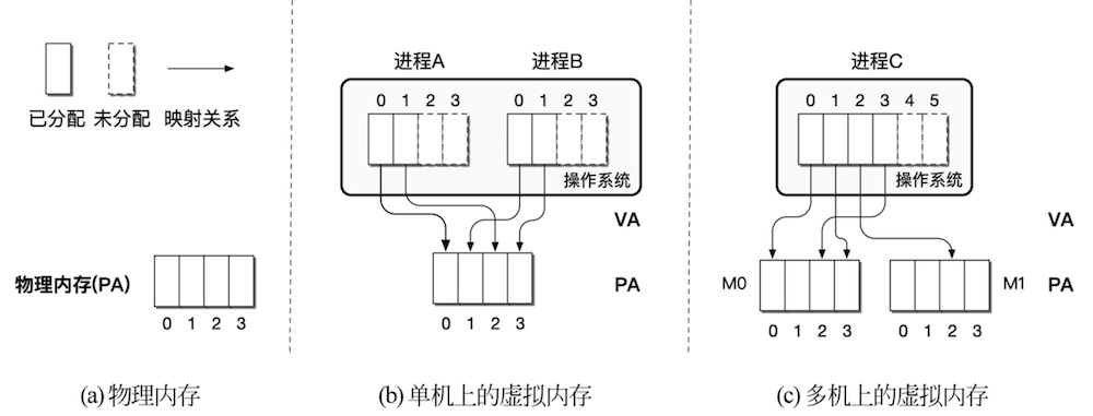 云时代的到来为计算机内存管理提出了新的挑战: `需要为客户机提供从0开始的、连续的、相互隔离的虚拟“物理内存”`,并且使内存访问延迟低,接近宿主机环境下的内存访问延迟。 **内存虚拟化**即给访存指令提供一个内存空间,或称为地址空间。地址空间必须是从0开始且连续的,可以形象地看作一个大数组,通过从0开始的编号访问其中的元素,每个元素储存了固定大小的数据 具体虚拟地址空间的类型有如下 #### 单机上的物理地址空间 对于一条访存指令,若系统中没有开启分页模式,在不考虑开启分段模式的情况下,这条指令可以访问全部的物理内存 指令访问的物理地址是从0开始且连续的。在计算机启动时,BIOS探测到主板内存插槽上的所有内存条,并给每个内存条赋予一个物理地址范围,最后给CPU提供一个从0开始的物理地址空间。从而每个内存条都被映射到一个物理地址范围内,软件无须知道自己访问的是哪个内存条上的数据 物理地址隐藏了内存条的相关信息,**给系统提供了从0开始且连续的物理地址空间抽象**,是一种虚拟化  *图片来自《深入浅出系统虚拟化:原理与实践》* 但如果只有一层物理地址空间,则系统中只能运行一个进程,无法对CPU分时复用 #### 单/多机上的虚拟地址空间 为了实现CPU的分时复用,操作系统提供了进程的概念 `一个进程即是一串相互关联、完成同一个任务的指令序列` 为了使不同进程的访存指令在访问物理内存时不会相互冲突,虚拟地址的概念被引入。每个进程都有一个独立的虚拟地址空间,从0开始且连续,VA到PA的映射由操作系统决定 这样,假设操作系统为 进程A分配了第0块和第2块的物理内存; 进程B分配了第1块和第3块的物理内存; 而两个进程的虚拟地址空间大小均为4。两个进程都可以使用虚拟地址0访问它们拥有的第0块虚拟内存,而不会引起访问冲突,如上图b #### 单机上的“虚拟”物理地址空间 如果保持物理地址空间的概念不变,继续更改物理地址空间,那就可以用虚拟内存代替物理内存条作为物理地址实现的后台。而物理内存可以提供给一整台机器使用,于是产生了`内存虚拟化`的概念 假设: 进程A运行在物理硬件上,它提供4块虚拟的物理内存给客户机A使用,分别对应其0、1、2、3块虚拟内存。 客户机A在此“虚拟”物理内存的基础上,继续提供虚拟内存的抽象,将第0、1块物理内存分别给客户机中运行的进程A1、B1使用,分别映射到进程A1的第0块虚拟内存、进程B1的第1块虚拟内存。 由于“虚拟”物理内存的抽象没有改变,客户机将不会感知到它所依赖运行的硬件发生变化  *图片来自《深入浅出系统虚拟化:原理与实践》* #### 多机上的“虚拟”物理地址空间 大数据环境下的应用都会占用大量的物理内存。单个机器渐渐无法满足大数据处理任务运行过程中所需要的内存空间。 于是,人们将关注点从**高配置的单机纵向扩展转向了数量较大的单机横向扩展**。 为了使大数据应用运行在多个机器上,而掩盖掉网络通信、容错等分布式环境下需要额外注意的复杂度,大数据框架被应运而生,如Spark、Hadoop等 **如果存在一个单一系统镜像,即在多个节点组成的分布式集群上给程序员提供一种单机的编程模型,则会极大地提高分布式应用的开发效率,彻底掩盖分布式系统的复杂性** 这其实就是DSM(`分布式共享内存`)的思想,用于实现“虚拟”物理内存,将获得一个容量巨大的“虚拟”物理内存。DSM在多个物理节点之上建立了一个“虚拟”物理内存的抽象层 这也被称为**“多虚一”,即多个节点共同虚拟化出一个虚拟机**。DSM保持了“虚拟”物理内存的抽象层不变,任何一个操作系统均可运行在这样的抽象之上,和运行在真实物理硬件上没有差别